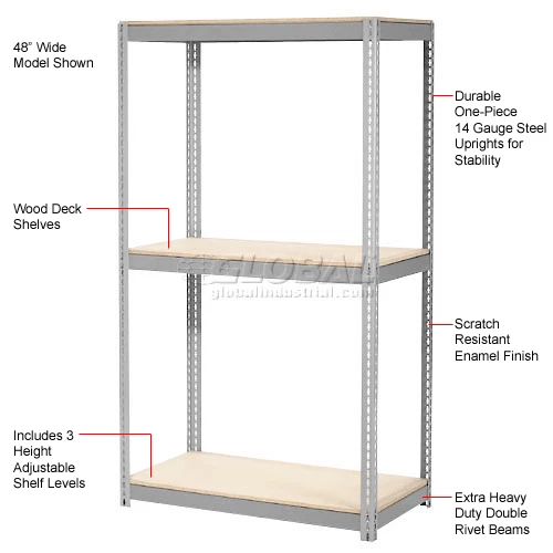 Easy to expand and assemble. Boltless design snaps together securely without tools or hardware. Open design allows access from all sides. Roll formed 14 gauge steel uprights ensure rigidity. Levels include rugged 5/8″ thick particleboard decking and adjust at 1-1/2″ increments without disassembly. Scratch resistant enamel finish.