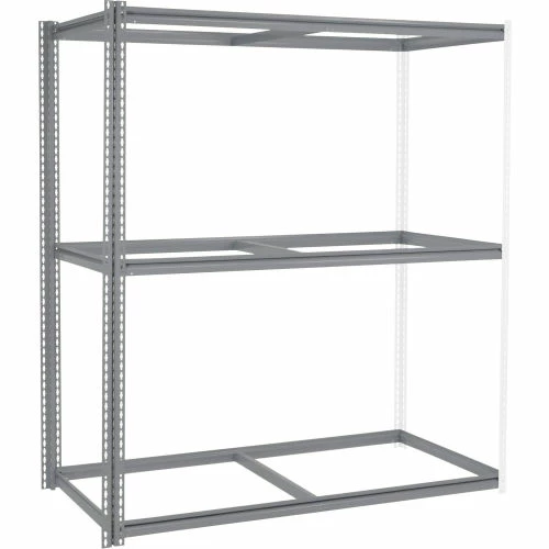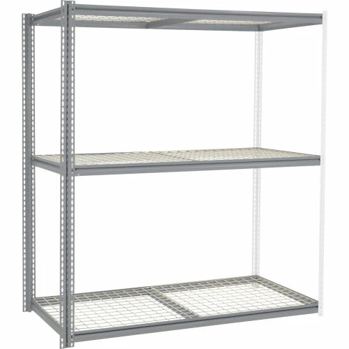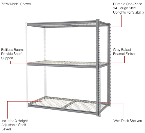 Horizontal beams are roll-formed to a Z-profile for added shelf capacity. Decking sits flush to beams for neater appearance and stability. 2-1/4″ x 1-1/2″ x 14-gauge uprights. Boltless, interlocking beams with double teardrop postholes assemble quickly and without tools. Levels adjust at 1-1/2″ increments. Includes rugged wire grid decking that allows visibility and light, air and sprinkler penetration (reducing insurance premiums). gray baked enamel finish.