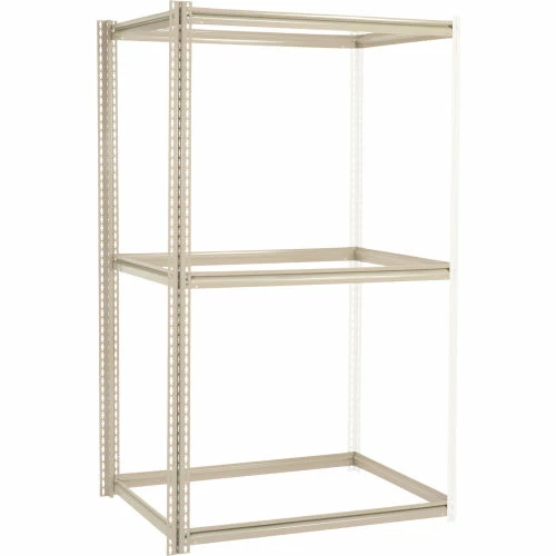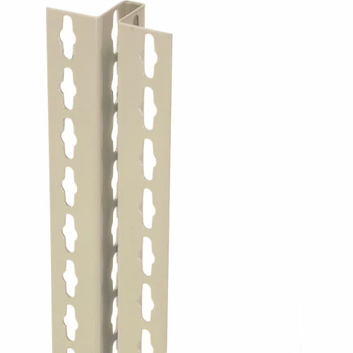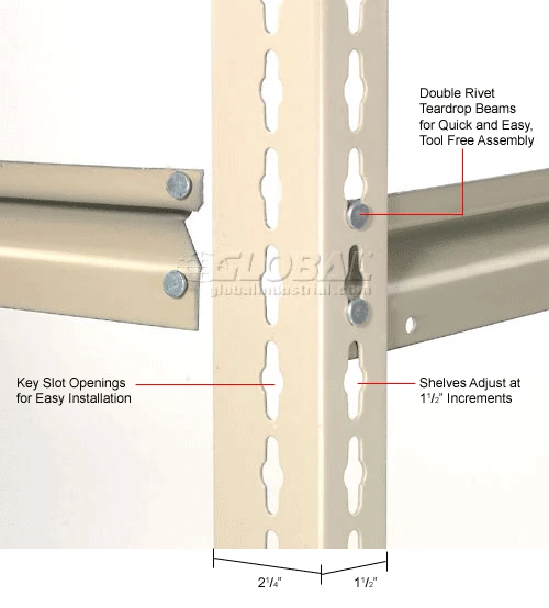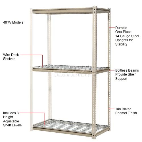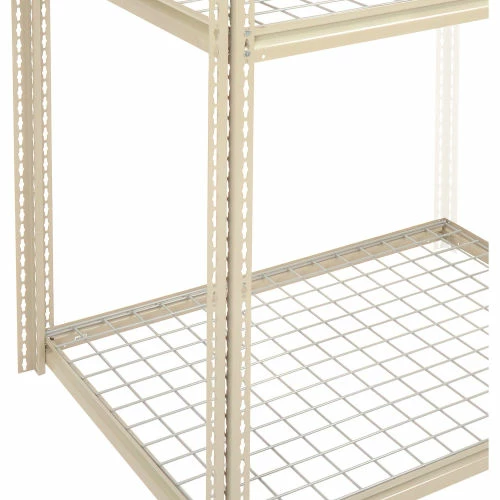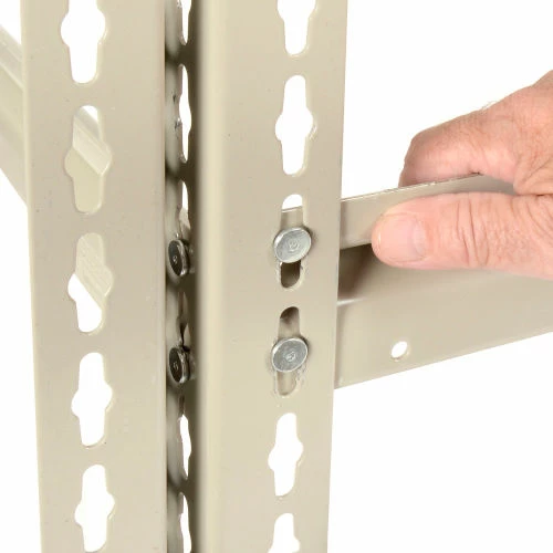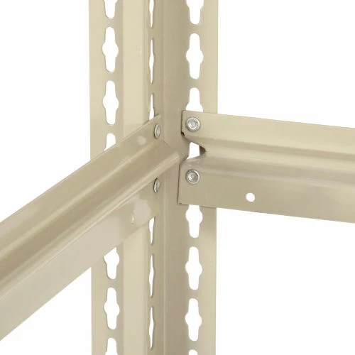 Horizontal beams are roll-formed to a Z-profile for added shelf capacity. Decking sits flush to beams for neater appearance and stability. 2-1/4″ x 1-1/2″ x 14-gauge uprights. Boltless, interlocking beams with double teardrop postholes assemble quickly and without tools. Levels adjust at 1-1/2″ increments. Includes rugged wire grid decking that allows visibility and light, air and sprinkler penetration (reducing insurance premiums). Tan baked enamel finish.