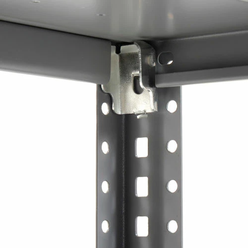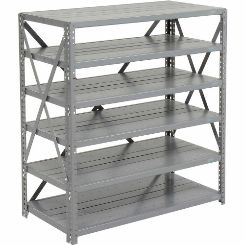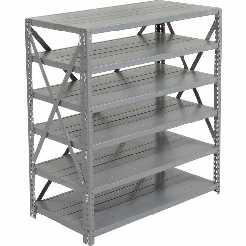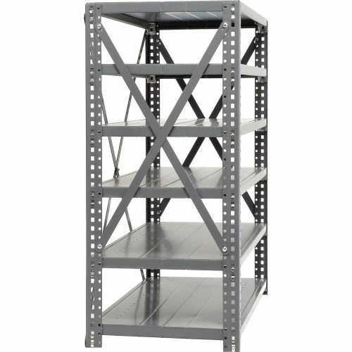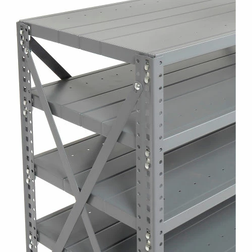 OPEN style shelving has anti-sway braces on the back and the sides for added stability. Easy to assemble rugged steel shelving with long-lasting gray baked enamel finish.