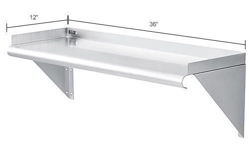 The stainless steel wall mount shelf helps maximizing storage space for food service environments, laboratories, and more. The durable stainless steel features 18 gauge type 430 construction, provides a sanitary and corrosion resistant work surface for maintenance ease. 200 lb. shelf capacity evenly distributed. 1-1/2″ lip on 3 sides with a 3/4″ radius front roll. Included shelf brackets and hardware mount easily. Top is polished to a #4 mill finish for a high quality appearance. NSF listed.