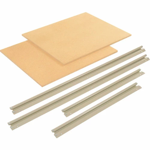 This 60″W x 36″D shelf can be added to existing rack. Made of precut 5/8″ particleboard, an economical choice for decking. Tan baked enamel finish. Includes 4 beams. 1500 lb. shelf capacity
