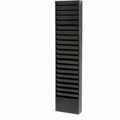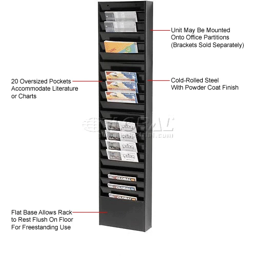 Prime cold rolled all steel construction with durable powder coat finish. Oversized pockets to accommodate larger sized literature and pockets are 12-1/2″ wide and 8-3/8″ high. Holds literature up to 3/4″ thick. Keyhole slots in the back make wall mounting easy. Unit ships fully assembled ready for use. 20 Pockets. 13-1/4″W x 4-1/8″D x 58″H overall. Black finish.