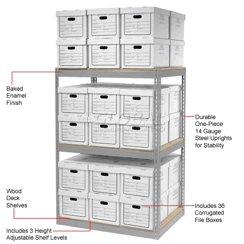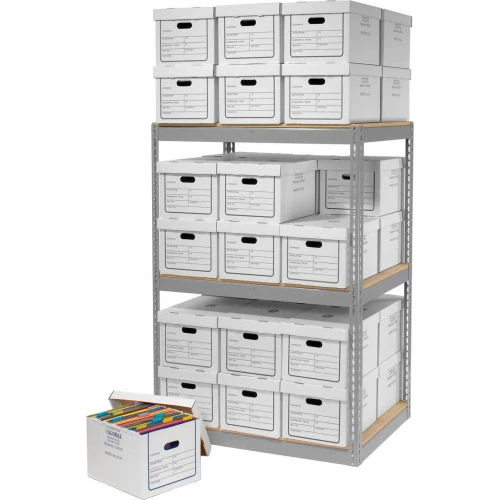 Rugged, roomy 200 test corrugated TRANSFER FILE with double-thick front/back walls help keep records protected and neatly organized…keeps out dust and dirt. Large printed label area for quick identification of contents and hand holes for easy handling. Boxes store securely on rugged 5/8″ thick particleboard decks. Heavy-gauge steel rack assembles without tools.