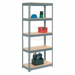 Roll-formed, ribbed steel shelves have box beam reinforced edges to provide increased load capacities. Quad clip safely secures shelves to uprights while allowing easy adjustment on 1″ centers. Heavy duty 14 gauge steel uprights support shelves. Closed side and back panels retain loads. Gray baked enamel with anticorrosion undercoat last for years. This Add-On Unit includes 4 uprights, 5 shelves, 4 quad clips per shelf, 1 back and 1 side panels plus all required nuts and bolts. See Right for extra shelves.