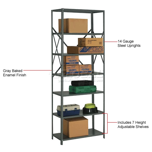 These heavy-duty 18-gauge steel shelving units have been engineered to adapt to your storage requirements. Ideal for stock room, factory or office where extra storage space is needed. Roll-formed steel ribbed shelves with integral box-form reinforced front and rear edges for greater load capacity. Shelves are easily adjusted on 1 inch centers. Rib-reinforced 14-gauge 1 inch x 1 inch steel posts. Phosphatized to prevent corrosion and for maximum paint adhesion. Finished in long lasting gray baked on enamel. See Right for extra shelves.