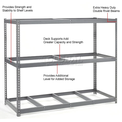 Beams fit 96″W decking and have an 800 lb. capacity. Also includes 3 front-to-back deck supports. (Supply your own decking.) Boltless assembly with snap together components requires no nuts, bolts, clips or tools.