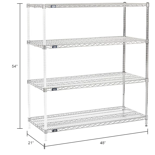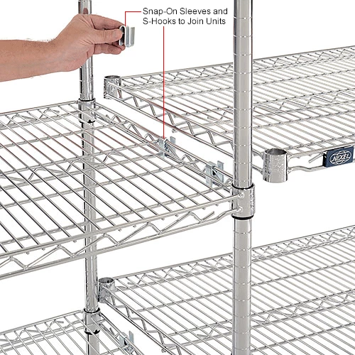 Add-On shelving units allow unit expansion to make the most of storage space. Includes 2 posts with leveling feet, 4 shelves, snap-on sleeves and S-hooks to join units. Chrome plated finish is attractive enough for retail display, but withstands warehouse conditions as well.