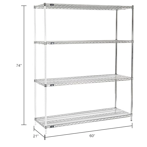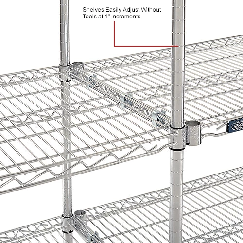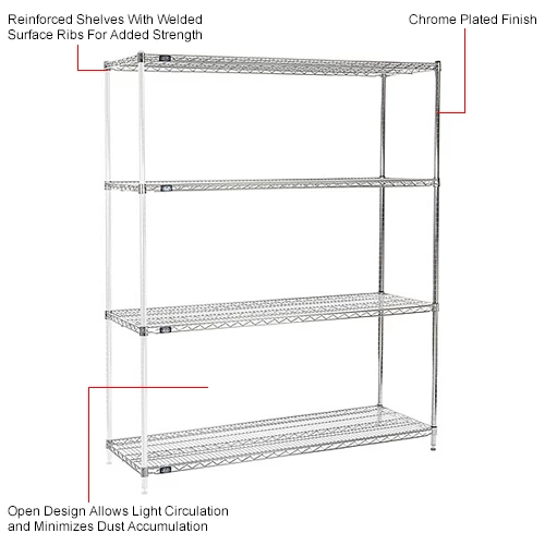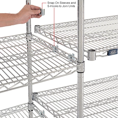 Add-On shelving units allow unit expansion to make the most of storage space. Includes 2 posts with leveling feet, 4 shelves, snap-on sleeves and S-hooks to join units. Chrome plated finish is attractive enough for retail display, but withstands warehouse conditions as well.