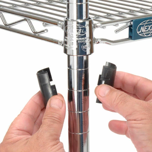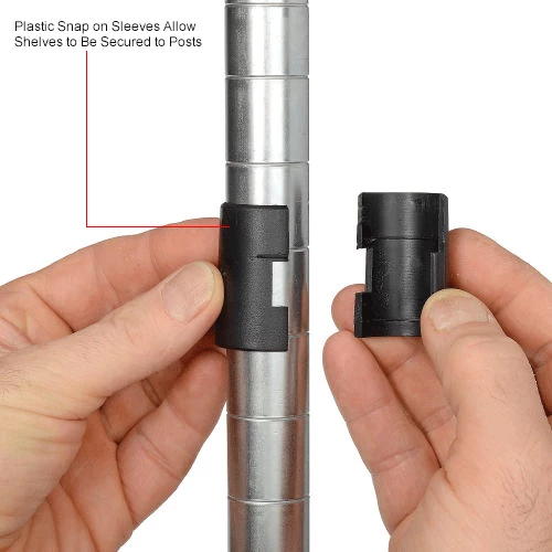 Each unit includes 4 split posts with leveling feet, 4 wire shelves and plastic snap on sleeves to secure shelves to posts.