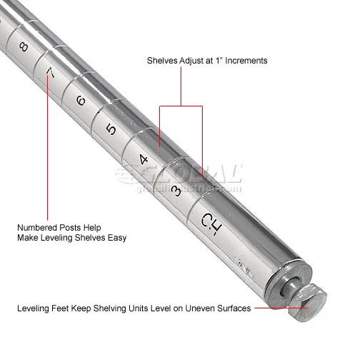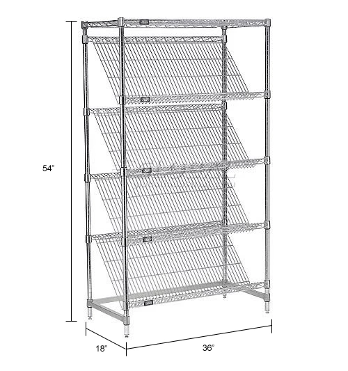 This slant shelf storage unit allows maximum visibility and easy access. Rear loading design assures stock rotation. Chrome finish is attractive enough for merchandise display, yet durable enough for warehouse inventory picking. Individual shelves adjust at 1″ increments and have a 400 lb. capacity. Shelves feature 4-1/4″H retaining lip front to keep contents in place. Total unit capacity 2000 lbs. Includes 5 slanted shelves and (4) 63″ Posts. Easy assembly.