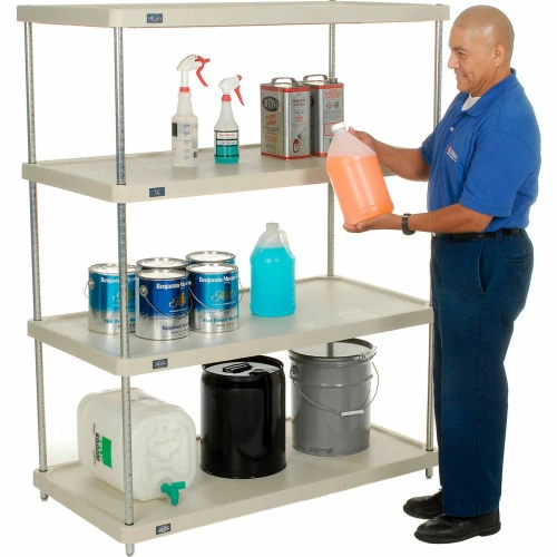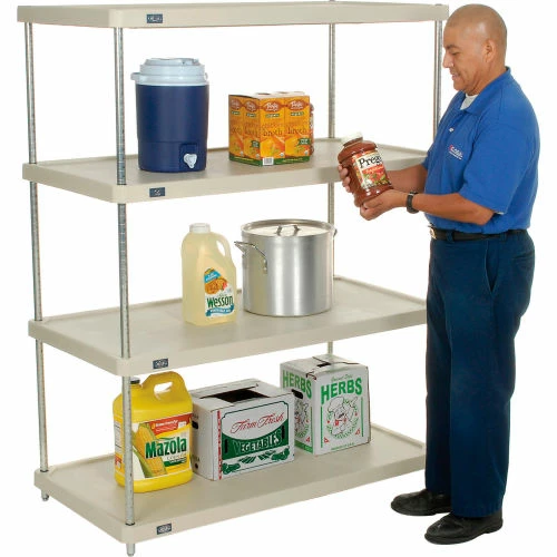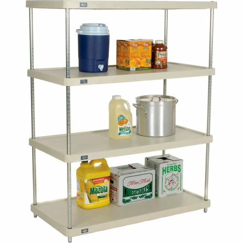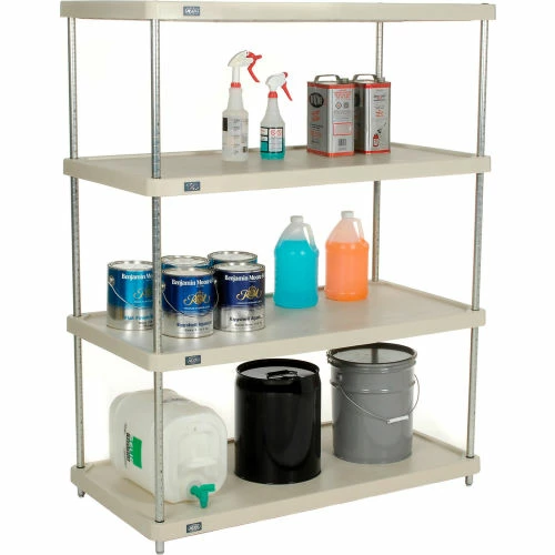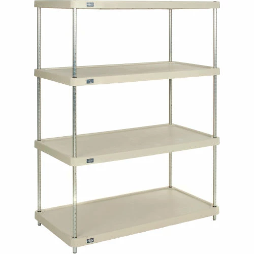 Solid Plastic Shelf Starter Unit These shelf units are ideal for dry storage, freezers and coolers. Starter Unit includes 4 posts with leveling feet, 4 solid plastic shelves and plastic snap on sleeves to secure shelves to posts.