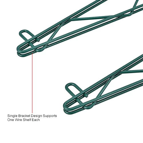Poly-Green® Single Arm Fixed Wall Bracket holds one wire shelf and attaches directly to the wall with the included wall-mounting plate. Add our Wire Shelf to these Shelf Brackets. Poly-Green® features a green powder-epoxy over zinc-chromate electro-plating that handles temperature and moisture extremes well. NEXGard®, an anti-microbial agent, protects the epoxy coating from bacteria, mold, and mildew that causes odors and product degradation. Limited Fifteen Year Warranty. NSF approved for wet or dry use. Mounting hardware not included.